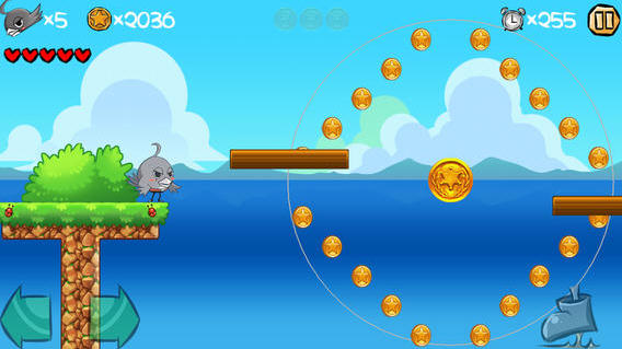 操作方面,游戏沿用了iphone平台惯有的虚拟按键操作,基础操作为屏幕左下角控制胖鸟的左右移动,屏幕右下角控制胖鸟的跳跃,一直触摸跳跃的话,胖鸟会跳跃的更高,跳跃的力度会随着触摸时间进行增高,并且从高处往下跳的话,触摸跳跃键还能够进行滑翔,遇到其他生物的时候,跳跃到生物头上可以进行践踏并且得到反弹力让胖鸟跳跃的更高,得到攻击型道具之后,屏幕中央右侧会出现子弹标示,触摸子弹标示即可攻击,除此之外,胖鸟还有2段跳功能,但必须在剑装模式下才可以实现,而操作模式为连续触摸两下屏幕即可,屏幕上方显示游戏界面各种功能标示,生命值,可重来次数,获得金币,收集的特殊金币,还有倒计时和暂停功能,布局整体看上去非常方便。